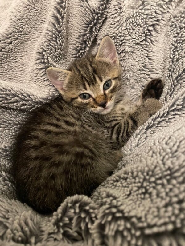 Slinky is more reserved and thoughtful than the other two. Enjoys touching your face with her paws (not her claws) and is very sweet. Was a little clingy as a tiny one, but has settled into a very affectionate cat that loves to sleep in your arms. She is just starting to come out of her shell and runs around all over with the other two playing til they wear themselves out.