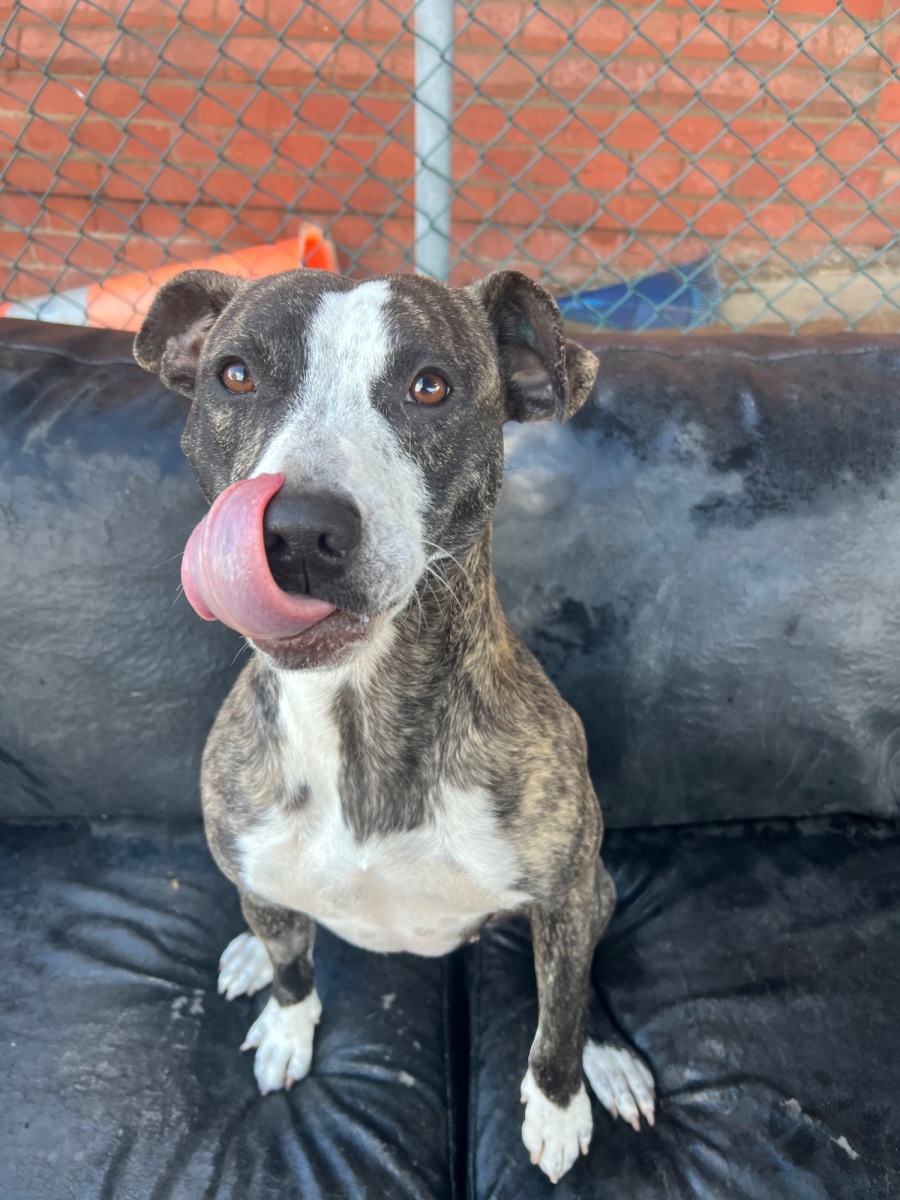 Meet Beth, a charming Staffy mix radiating joy and affection. With her social nature and welcoming personality, she's sure to fill your home with happiness. Whether she's engaging in playful antics with her canine friends or being the perfect couch companion, Beth exudes warmth and friendliness. Her love for socializing is boundless, whether it's with her human handlers or her fellow furry companions.