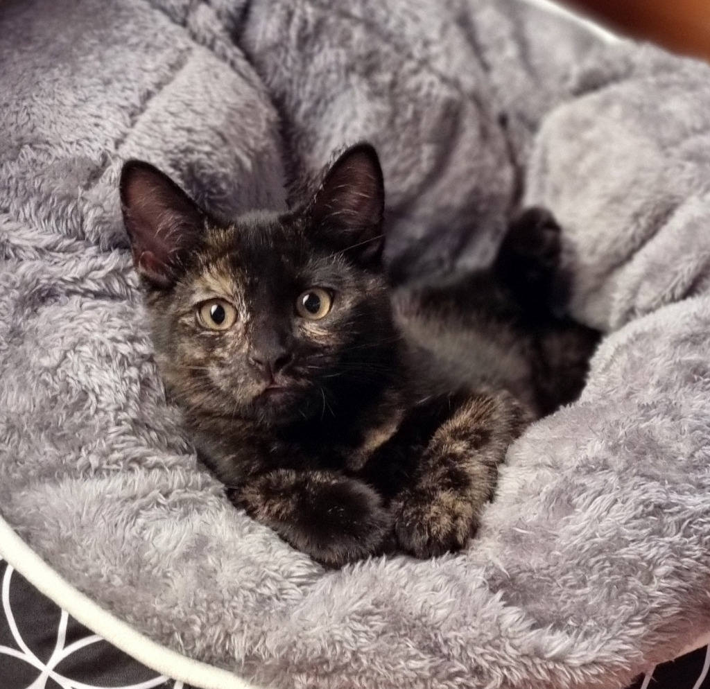 Ash is a confident and curious kitty with loads of purrsonality! She loves to perch in high places and keep an eye on everything from all angles—nothing escapes her watchful gaze.