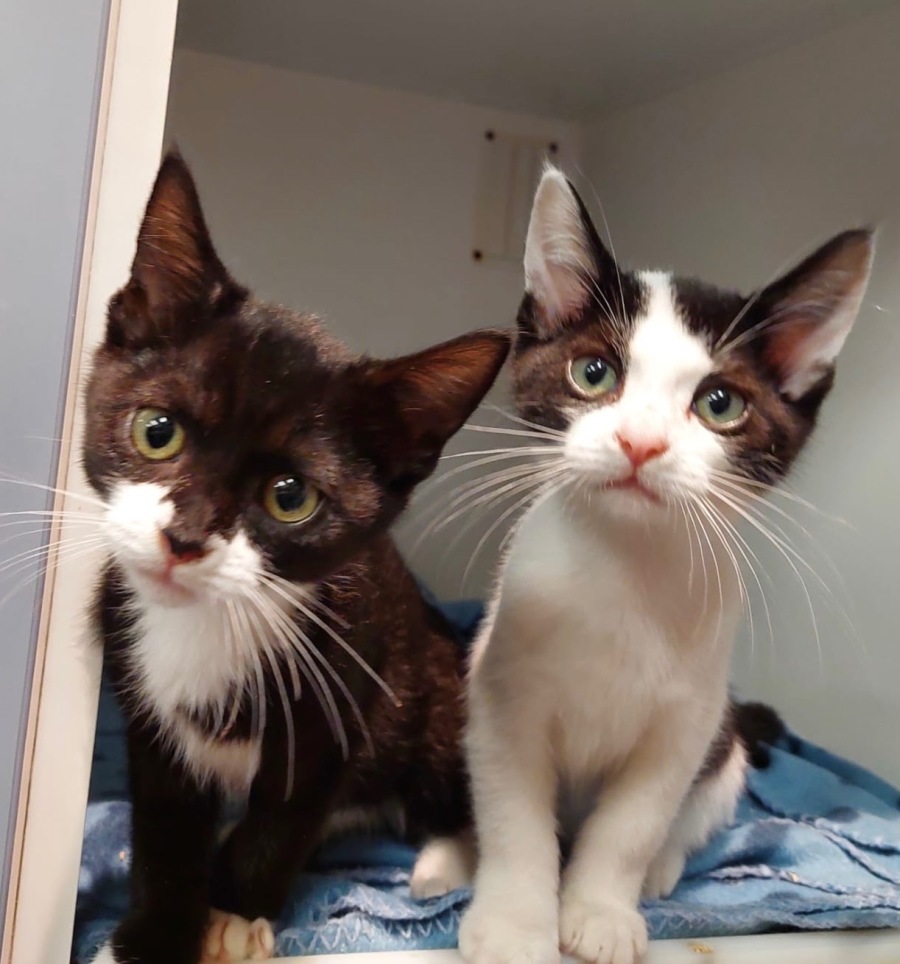 Meet Lunar and Polar, a picture perfect pair of playful 3 months old kittens with silky black and white fur and bright, inquisitive eyes. While not technically bonded, these two adore each other and we would love to see them stay together. They are full of curiosity, charm and kitten mischief, always exploring, pouncing and looking for the next bit of fun.