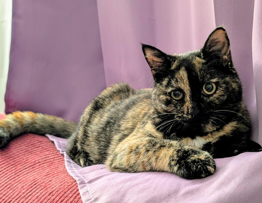 If you're looking for a fun, loving girl with personality in spades, Olympia is your perfect match. She's the ideal blend of affection, playfulness, and tortie mischief.