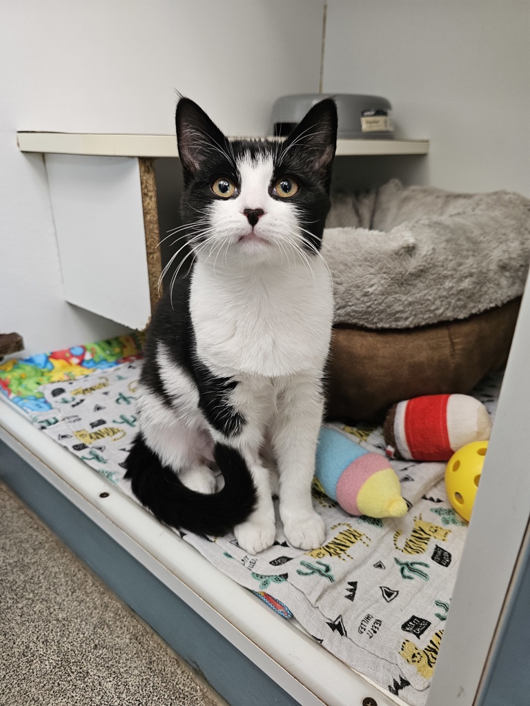 Hey there, I'm Cheerio. I'm a friendly and affectionate kitten who would suit most homes! My playful paws are always ready to pounce on anything that moves. I love playing with wand toys and mysterious shadows on the wall! When I'm finished playing, I love nothing more than finding a warm lap to curl up in.