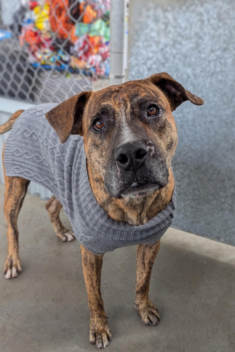 Finn was brought into the facility as an unmicrochipped stray, (along with another large male dog) after being found in a known dog dumping area. Both boys were completely covered in scabs, scars, wounds & injuries, which we can only guess were made by multiple dog attacks. Finn was understandably very scared & shut down when he first arrived. No one came looking for either dog.