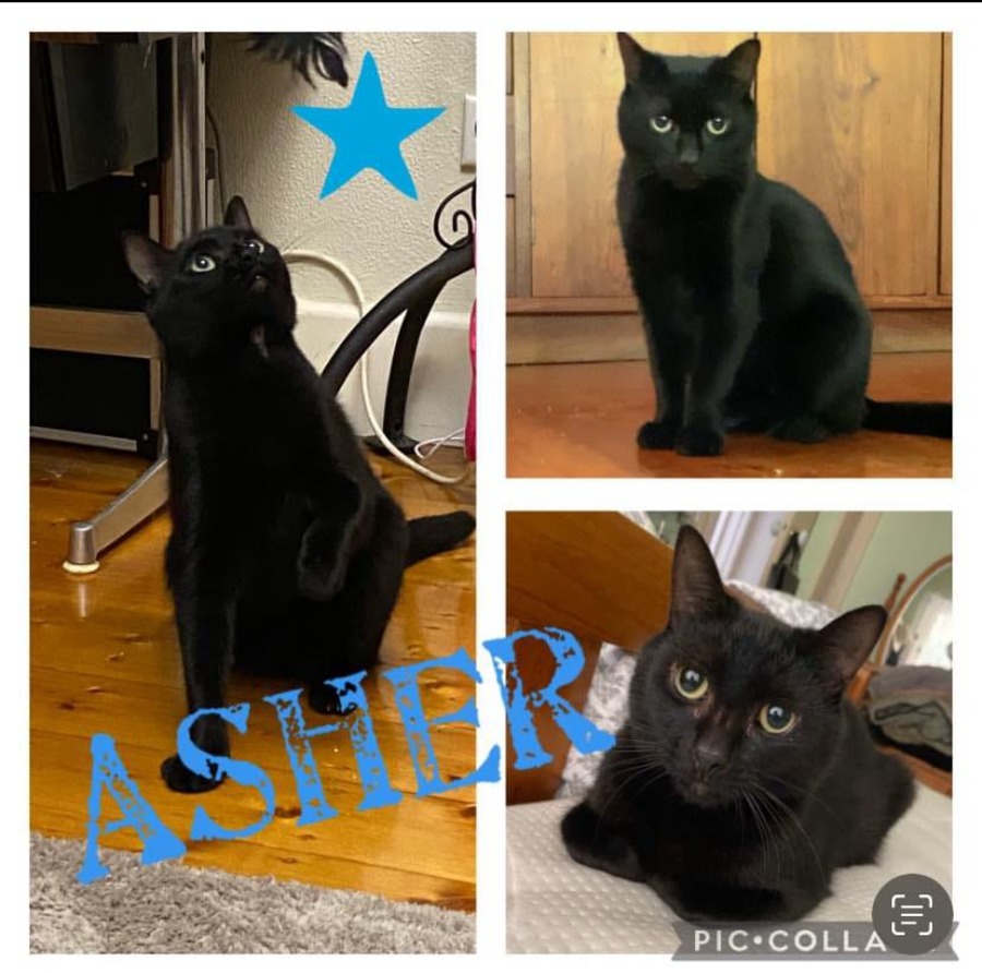 This sleek black beauty is not your average lap cat. He’s incredibly selective with his affection and prefers life on his own terms. Asher doesn’t enjoy being picked up or fussed over. He’s the kind of cat who keeps you company without needing constant attention. On rare occasions—when things are quiet and you're sitting still for a while—he might choose to sit on your lap, but even then, pats are on his terms.