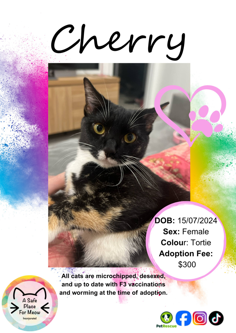 In her foster home, Cherry has thrived in the company of her furry companions and has formed strong bonds with her siblings. Her playful spirit shines through as she chases after toys, bounces around during playtime, and engages in adorable antics that are sure to brighten up any room.