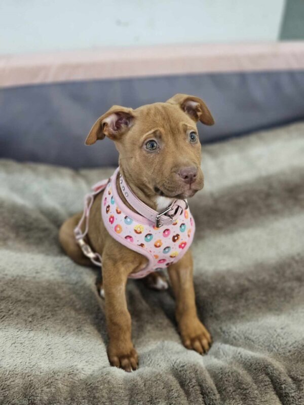 Hello there! My name is Neveah and I'm a 2 months old female American Staffordshire Terrier puppy. I'm searching for a forever home where I can grow and thrive. I'm a social butterfly who gets along well with other dogs and I've got no issues with kids. I'm a moderately active pup, so a daily walk or playtime in the yard would be perfect for me. I'm still learning about this big exciting world, so I need someone who can guide me with patience and love. I don't have any history of issues with other animals, so if you have other pets, that's great! I'm pretty flexible and can adapt to an average work hours schedule. Choosing me means you're ready for the rewarding challenge of raising a puppy. I promise to repay your efforts with endless love and loyalty. Are you ready to be my forever friend?