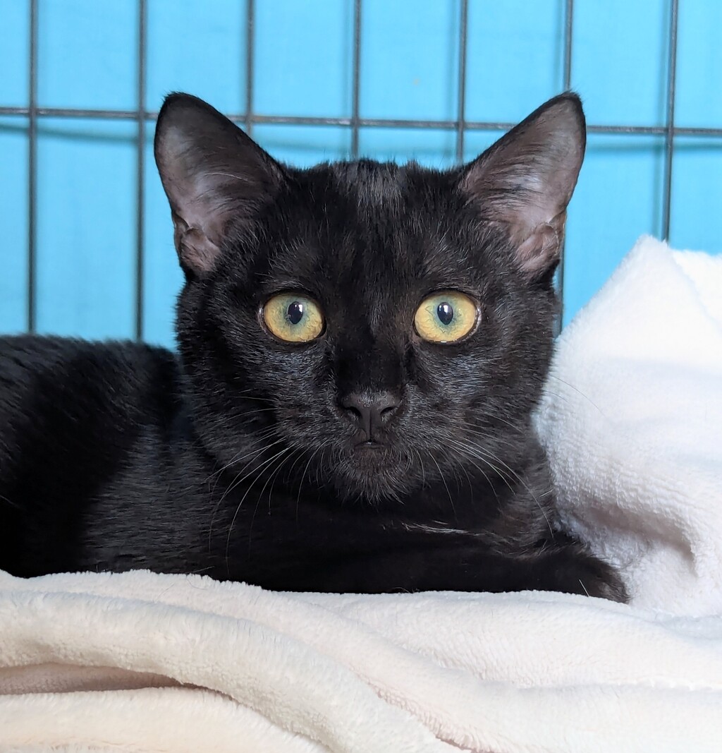 April is a sleek, jet-black stunner with striking "cattin" good looks and a gentle soul. While she arrived into care absolutely terrified, this sweet girl has slowly started to show her soft, trusting side to those who've earned it. With time, patience, and a calm environment, April is sure to blossom into a loving companion. *April must go to a home with a confident, cat-social feline friend to show her the ropes.*