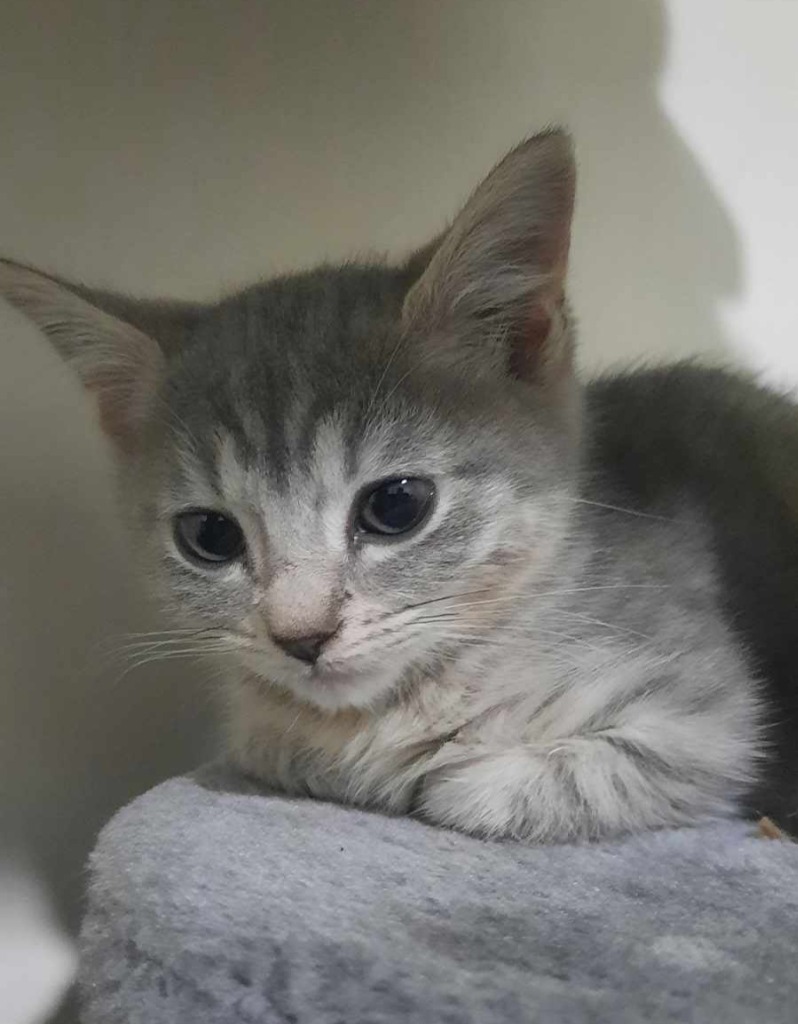 Birdie is a shy but affectionate female grey kitten who melts hearts with her gentle head butts. She loves cosy hiding spots, soft ball toys, and would thrive in a calm, patient home where she can blossom.-