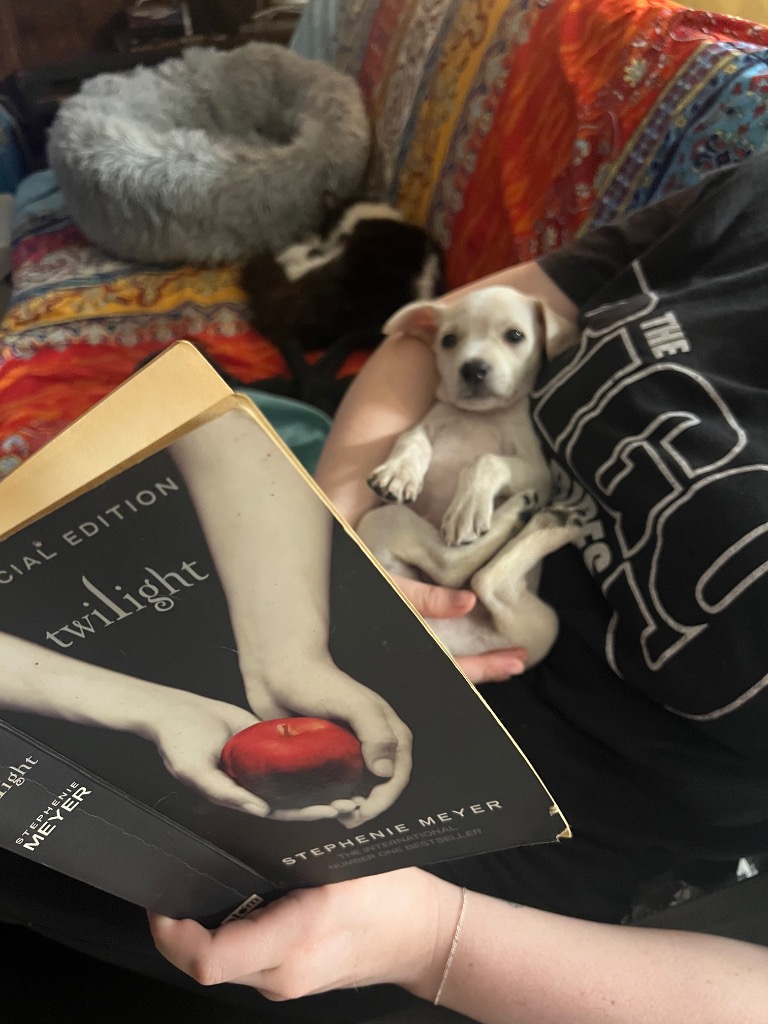 Living in a house with lots going on - teenagers , puppies , adult dogs , adult cats , chickens , fish , and survives and thrives with them all .