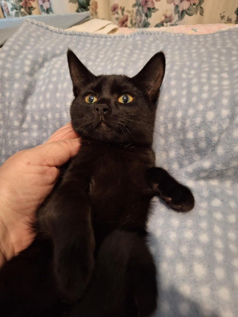 Midnight is a stunning black beauty—void in color, but absolutely not in charm. With his sleek coat and soulful eyes, he turn heads without even trying. A little shy at first, he is quick to warm up and love being picked up and cuddled. Once he's chosen you, you’ll have a calm, affectionate companion by your side.