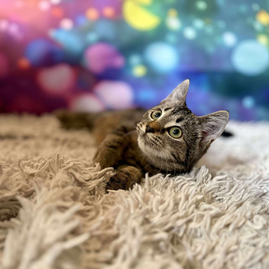 Victoria is the total package – sweet, playful, and absolutely food-obsessed! This gorgeous tabby girl purrs the moment you look at her and loves nothing more than snuggling up between bursts of kitten zoomies. She’s curious, confident, and always ready for her next adventure… or snack!