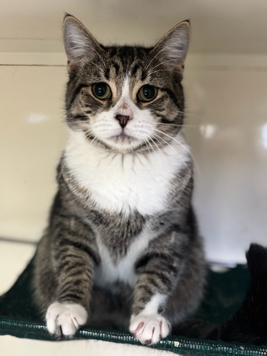 Pirate Pete is a white and grey tabby with expressive eyes and a personality that wins hearts. He is missing one of his back feet but you would hardly notice. He gets around just fine and doesn’t let it slow him down. Pete is a true lap cat who loves company and is always happy to greet visitors from the comfort of his favourite bed box.