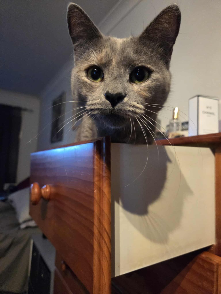 Jasmine is a beautiful, affectionate cat with a stunning mottled grey and ginger coat — a true beauty both inside and out. She adores human company and will happily spend her day nearby, ready for cuddles or a quiet chat.