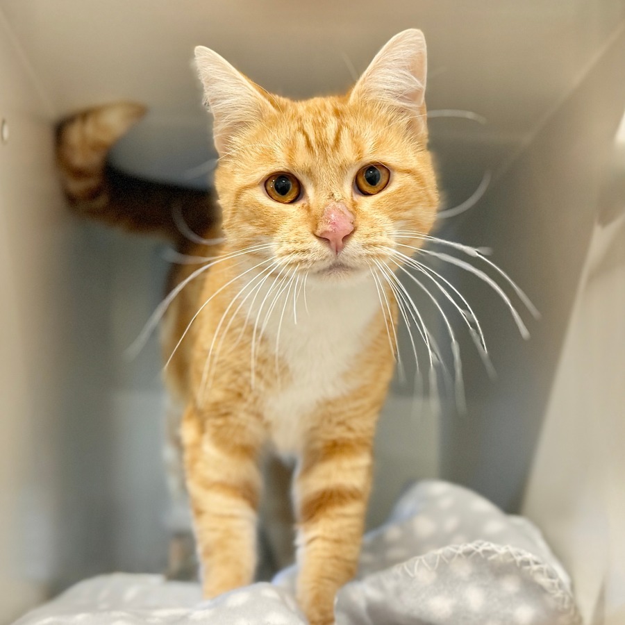 Puggy enjoys the company of humans but prefers to keep his paws on the ground. While he may not like to be held, he expresses his affection in his own unique ways. Puggy loves to offer gentle head nudges and soft purrs and will follow you from room to room, always nearby, content to be in your presence.