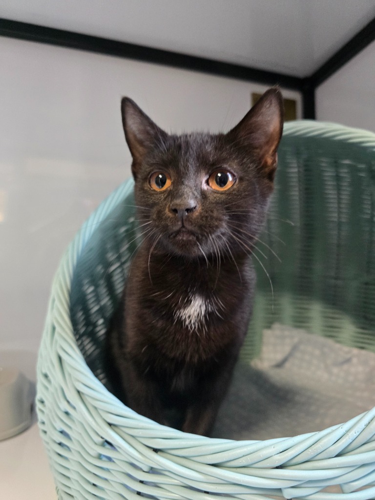 Chuckle is a sleek black beauty, with a tinge of white. She is full of energy, athletic and clever. Chuckles adores other cats and children. She particularly likes stealing toys and running away with them in her mouth, she can get a fierce growl up 'protecting' her stolen item from other cats but is never aggressive, she is very cute and comical. Chuckle will need a house with space for her to move, as she is highly active. Once her energy is expelled she does love a cuddle and a pat. Chuckle will make a beautiful family pet. Untested around dogs. Come meet her at our Burnie adoption centre