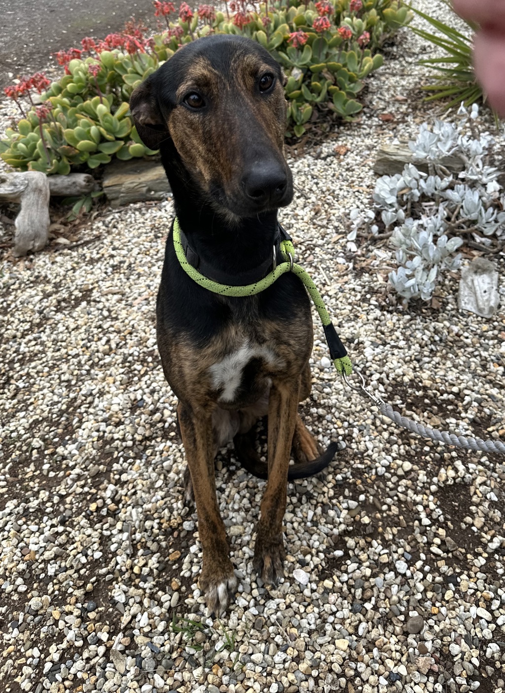 Bauer is a gentle soul. He walks beautifully on lead and absolutely loves his daily strolls. Whether it's outdoor adventures or quiet evenings on the couch, Bauer just wants to be part of the action. In fact, he's known for curling up into the tiniest doggy ball you've ever seen-defying both logic and his lanky frame-just to snuggle in close on movie night.