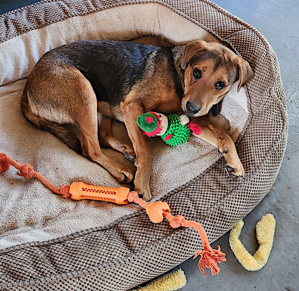 This young lady has had a pretty awful start to her short life (she is approximately 9 months old). When we took her into care she was fearful, traumatized and suspicious of everything and everybody. Our wonderful carer has put a lot of time into bringing her out of her shell, helped by her lovely dog, who has been patient and sweet with her.