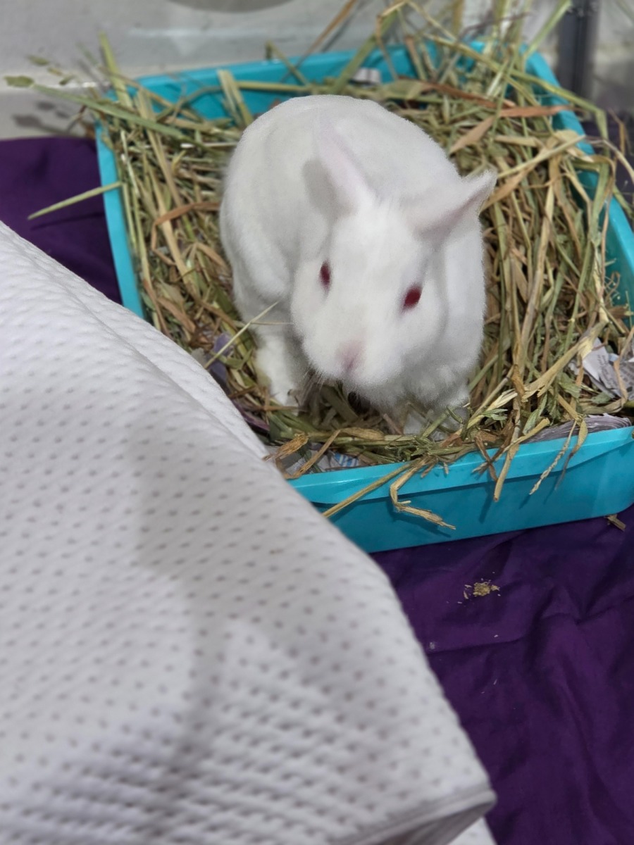 Froggy has a penchant for cozy spaces and can often be found lounging on or inside boxes, digging around in blankets, or lounging on fresh hay. His taste buds are delighted by mixed greens and he enjoys munching on selective science pellets to keep himself healthy and happy.