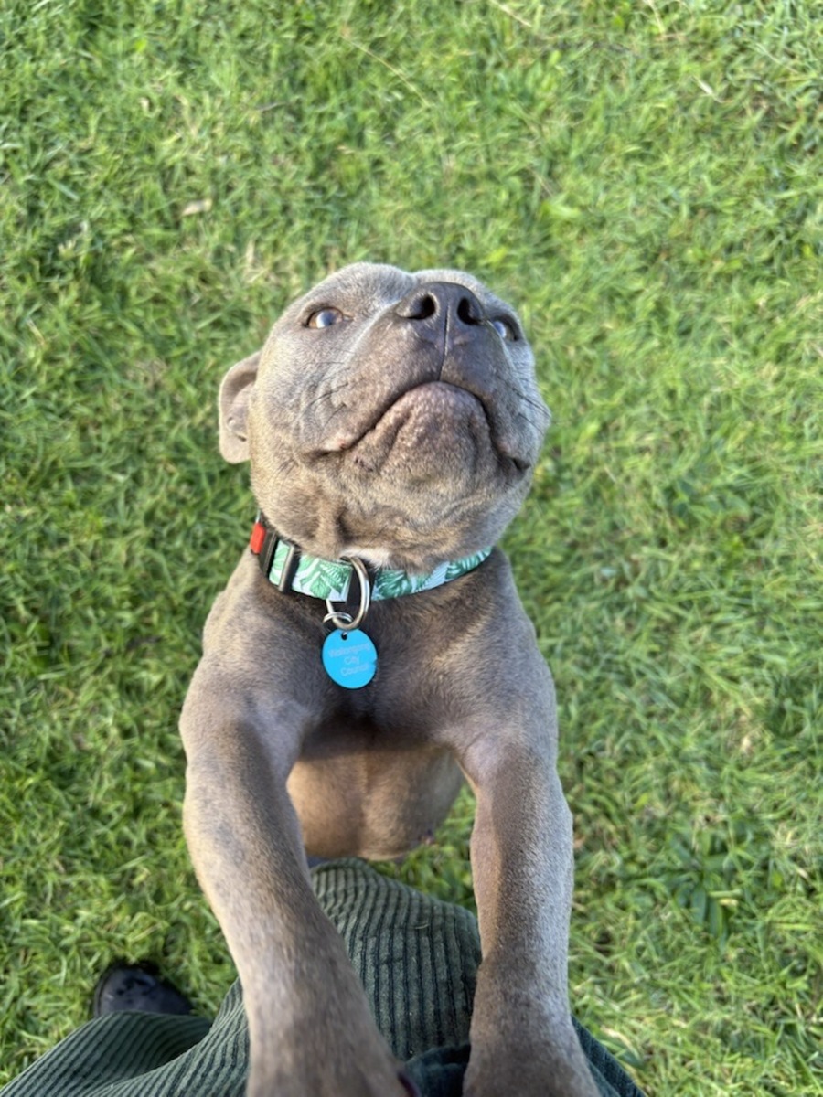 Meet Shevah, the beautiful blue English Staffy with a heart as radiant as her coat. Shevah bubbles over with happiness and friendliness and is sure to bring joy and laughter to a family ready to embrace her vibrant personality.