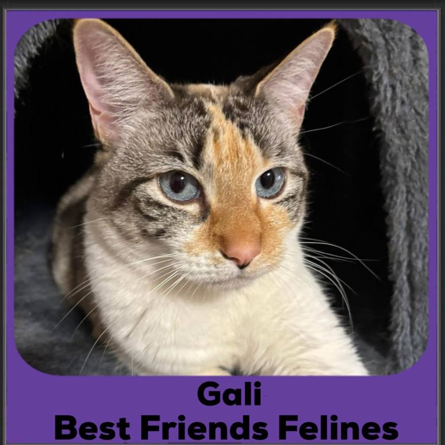 Gali is strikingly beautiful inside and out! Not only does she have dazzling ice blue eyes and a uniquely pretty coat, but she's a confident and ridiculously affectionate kitty who looooves humans! She loves everyone she meets, any stranger that enters the house, adult or child. She loves cuddling up with people and will always want to sleep beside you in bed, too. She loves running around after toys like a kitten, and she has an absolutely adorable meow that doesn't sound like a meow at all. She always wants to be around you and loving on you. If you adopt her, all your friends who meet her will want to steal her away from you!!