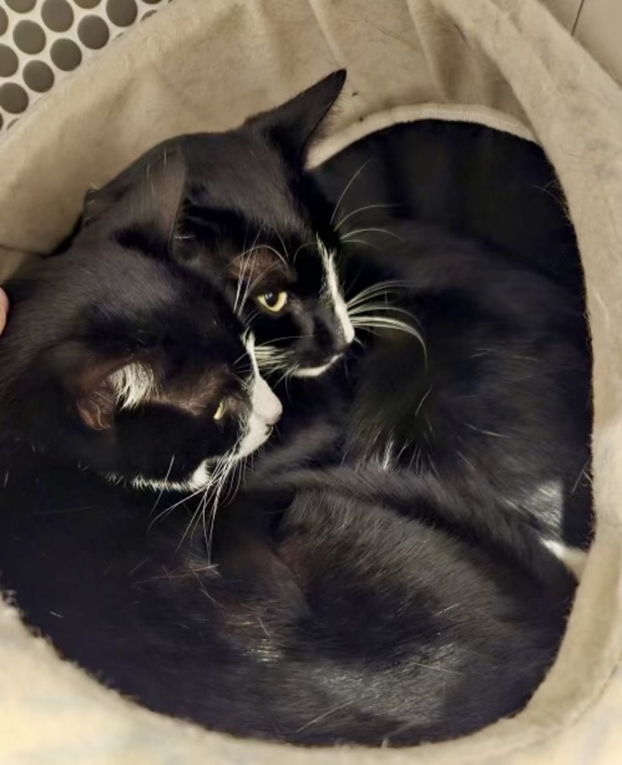 Mieka is a petite tuxedo beauty with ocean-deep eyes and a quiet grace. She thrives in calm spaces, soaking up sunbeams and showing affection once trust is built. Loki is her playful, curious shadow, a black and white sidekick who loves following his humans, opening doors and offering emotional support with a purr. Together, they are the perfect blend of gentle and goofy. They’re looking for a peaceful, patient home where they can stay together, continue to blossom and finally feel safe.