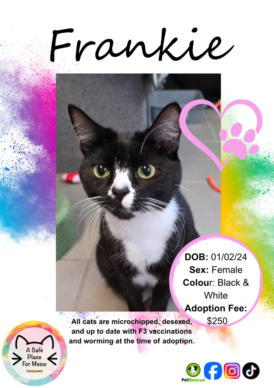 Meet Frankie, the petite feline with a heart as big as his love for food. This small cat with a sweet demeanor has a unique ability to make you feel cherished every minute you spend together.