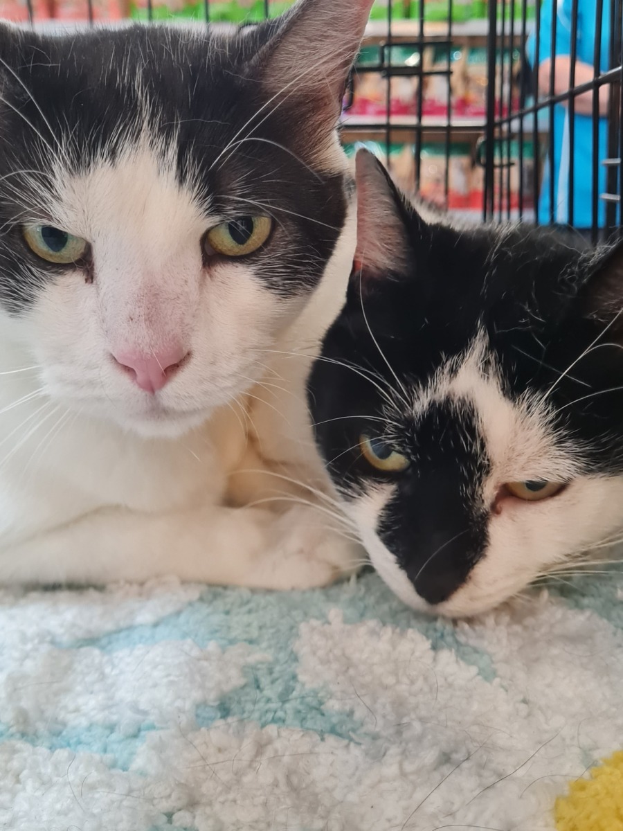 Both Lisa and Archie are domestic shorthaired cats with a short black and white tuxedo coat. Both have beautiful marking making them unique to themselves.