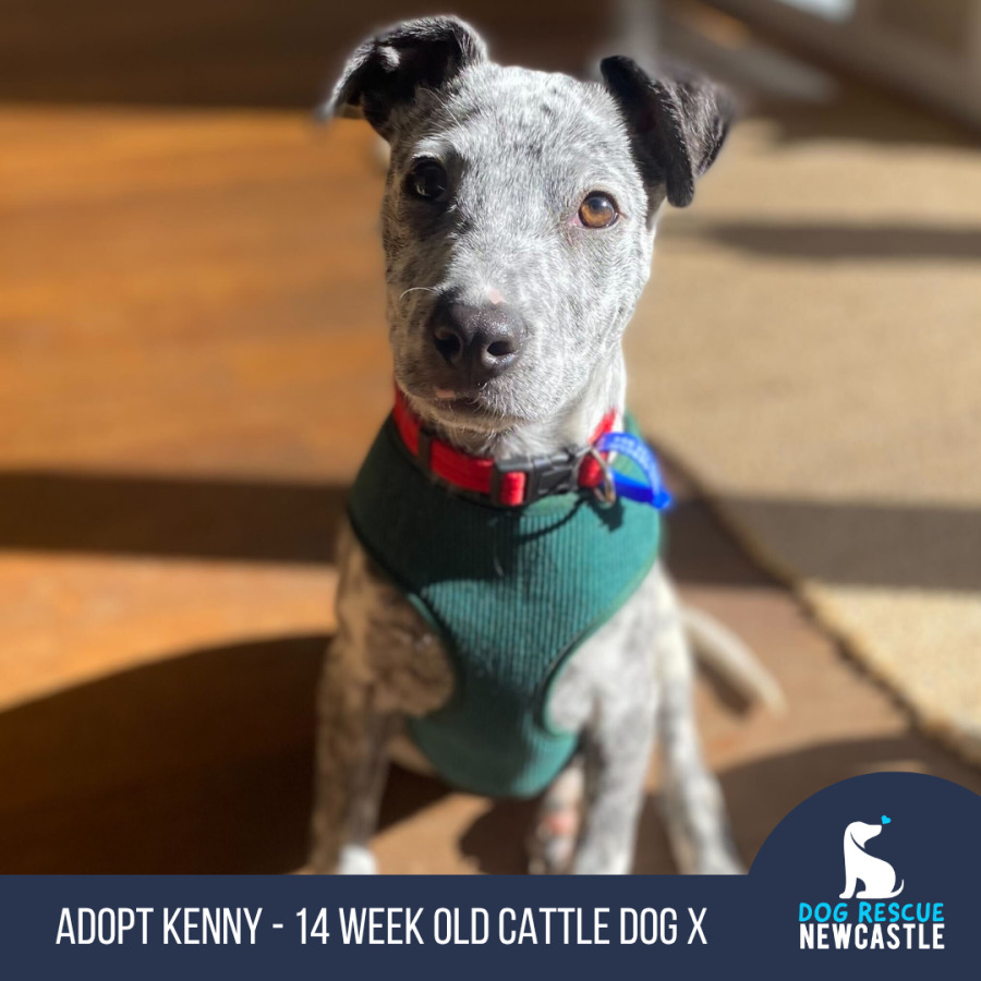 Kenny is a 14 week old Cattle X weighing in at 6.5kg. He is a confident pup with so much love to give. Kenny loves to wrestle with his two foster sisters and any other dog he meets before snuggling up with them. He has been very well socialised with other puppies and adult dogs, small and large. He is learning to trust people and is very cuddly and loving. Kenny has met cats through a fence and showed positive behaviours.