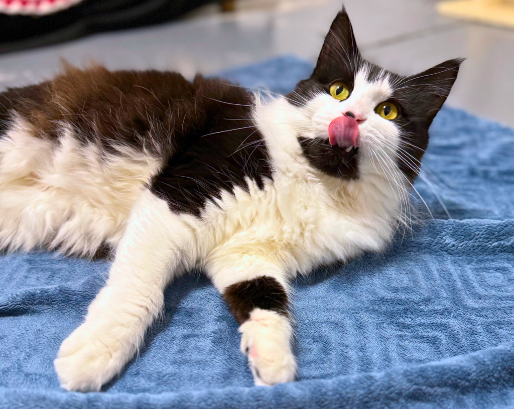 She prefers wet food, loves freeze-dried treats, and eats best with company. She's also a champ with nail trims and easygoing in new situations.