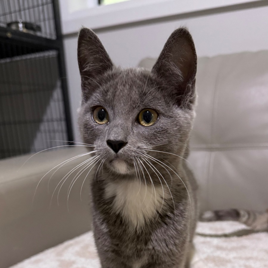 This adorable little lady is Arya….our 14wk old DSH who has a beautiful thick grey coat, resembling that of a Russian blue.