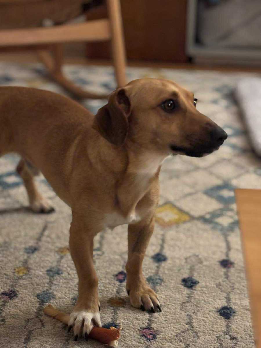 He gets along well with other dogs although at food time gets a bit aggressive so has to get fed separately. Although we do not have cats he fits right in with two other sausages and a huge Great Dane. He will sleep in a crate at night but I feel he would love someone who will let him sleep on the bed. He isn’t house trained yet so there will be a few accidents and he does like to mark his territory but I feel once he settles in all of this will stop and making sure he gets outside regularly.