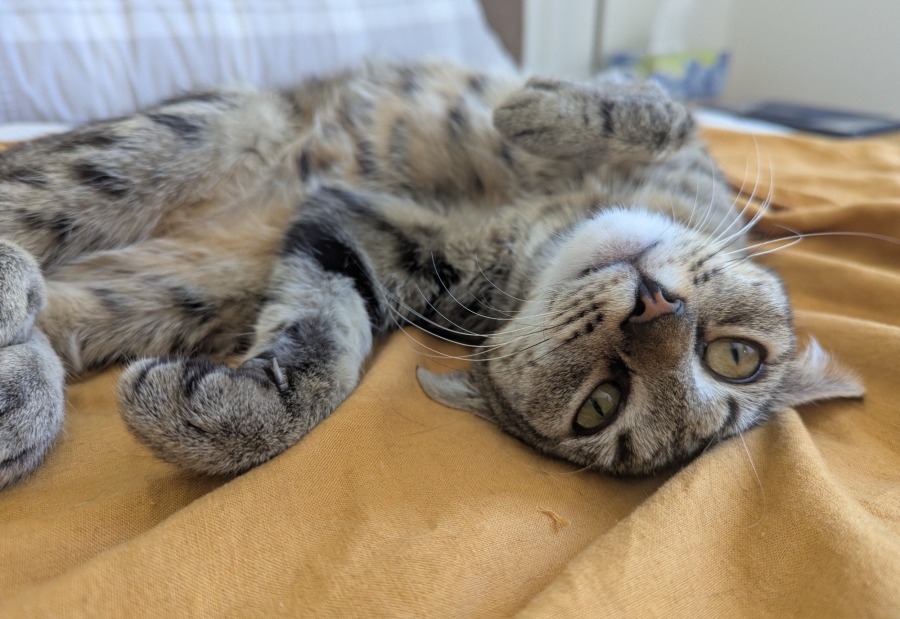 Sunny is confident and unfazed by the world around her. Barking dogs next door, children, new environments - she handles it all calmly. She’s independent and happy doing her own thing, but when she chooses affection, it’s deeply special. In quiet moments, Sunny will come in close, rub against you, purr loudly, drool a little, and gaze up at you with huge, expressive eyes full of love. It’s intimate, intentional affection, and it’s beautiful.