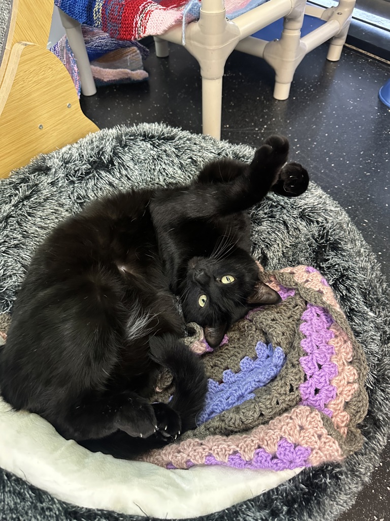 Flicker is seven years young and fully committed to his role as the mysterious yet lovable black cat in your life. He's basically the feline version of that one sarcastic friend who complains about everything but secretly loves you.
