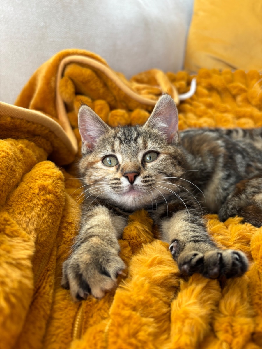 Say hello to Tulip, a sweet and gentle 11-week-old Torbie Domestic Short Hair kitten who is searching for a loving new family. Tulip's super affectionate nature will melt your heart, creating a bond that will leave you smiling every day.