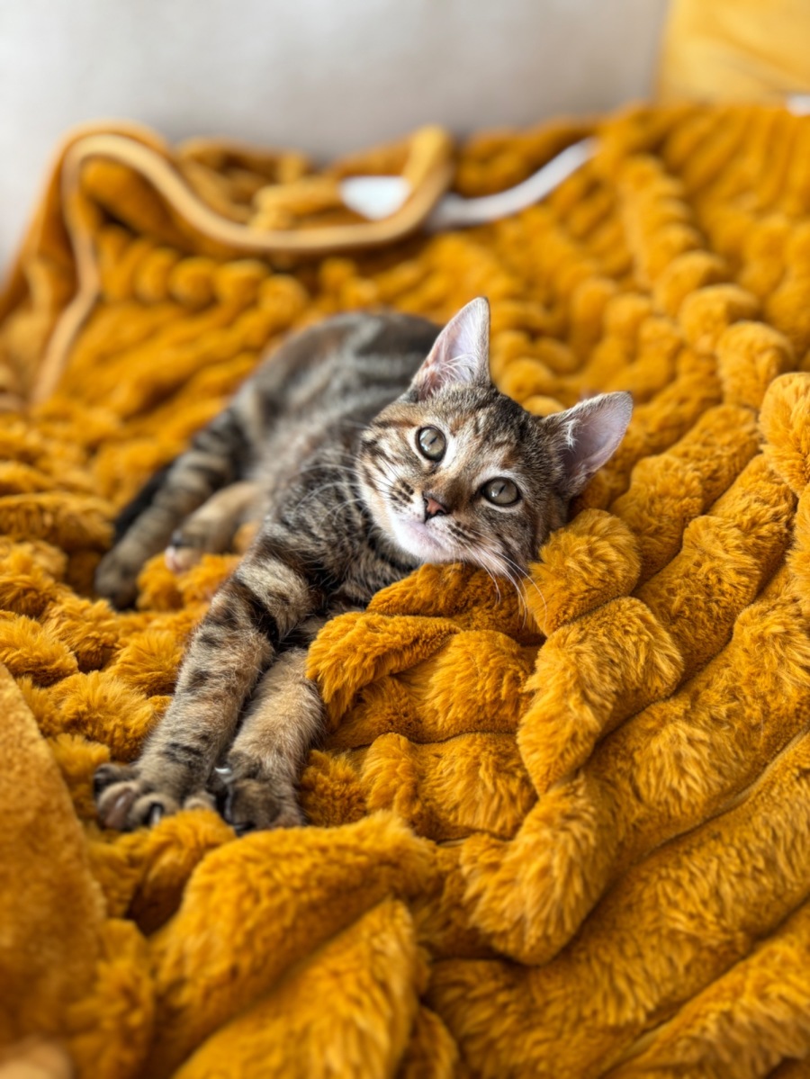 Meet Tilly, a delightful 11-week-old Torbie Domestic Short Hair kitten who is as sweet and gentle as they come. With her multi-colored coat and curious eyes, she's the perfect blend of playfulness and affection. Tilly has a natural friendliness that makes her instantly endearing to everyone she meets.