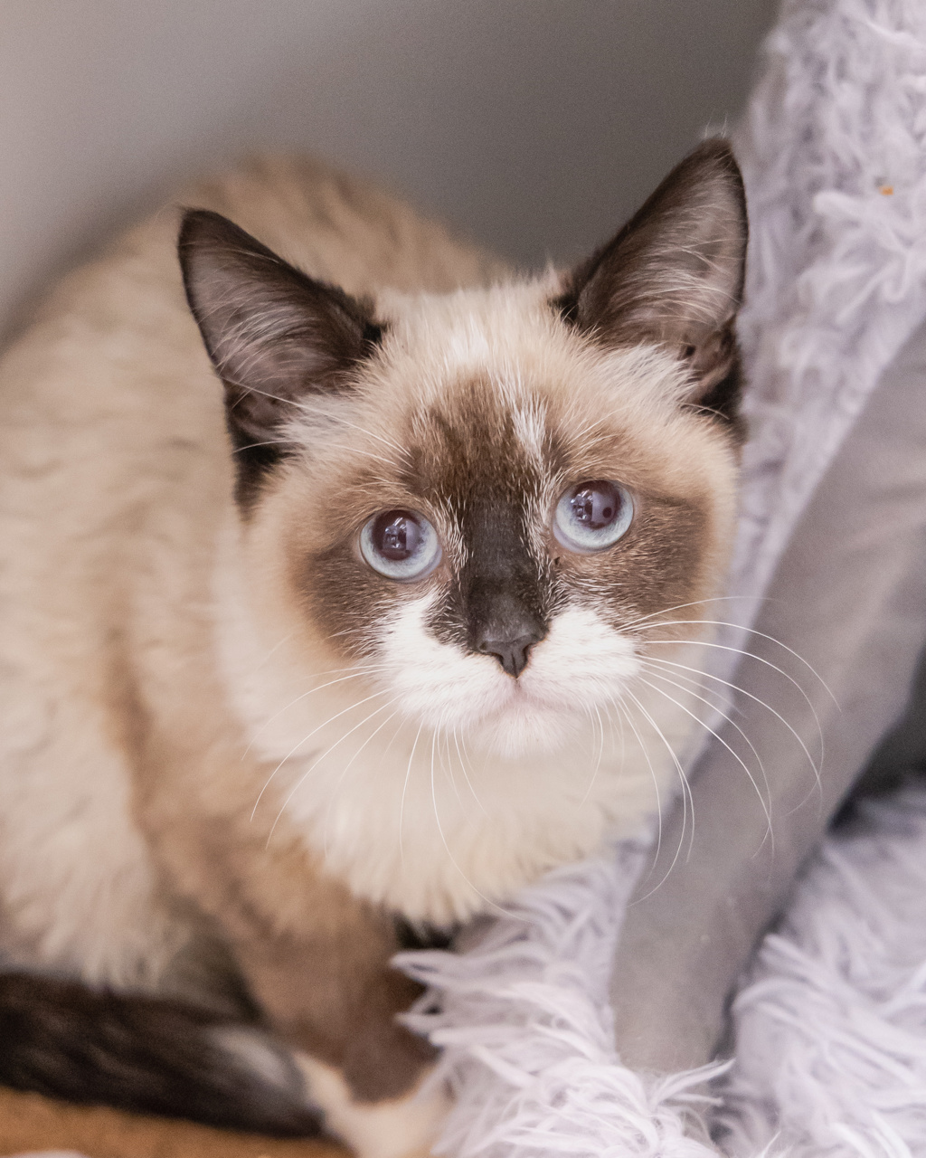 Hi, I'm Crab. I am looking for a kind and patient person or family to show me that humans are amazing. When I was younger, I didn't see too many people so I am still learning that humans are the providers of my delicious snacks! Once I get to know you, my shyness will turn into trust, and I'll be right there beside you, ready to share soft purrs and quiet moments. So, if you're looking for a gentle and quiet furry friend, please consider adopting me!