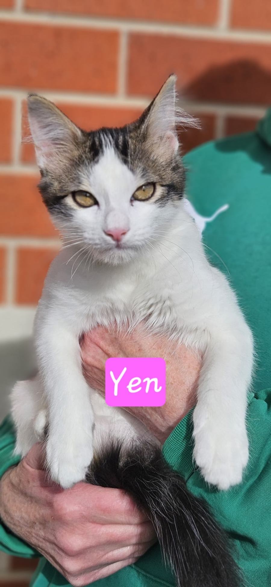 Yen's date of birth is 14 February 2025. She is a medium hair white with tabby markings kitten with a floofy tail.