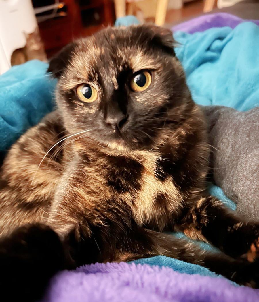 She has a soft spot for her feline foster siblings and will need at least one friendly feline in her new home to keep her company. After a slow introduction she will be ready to snuggle up with you and them. Although she is a slow eater, ideally she will need a home where grazing her food is possible — something that’s been tricky in her foster home as her foster siblings are big foodies.
