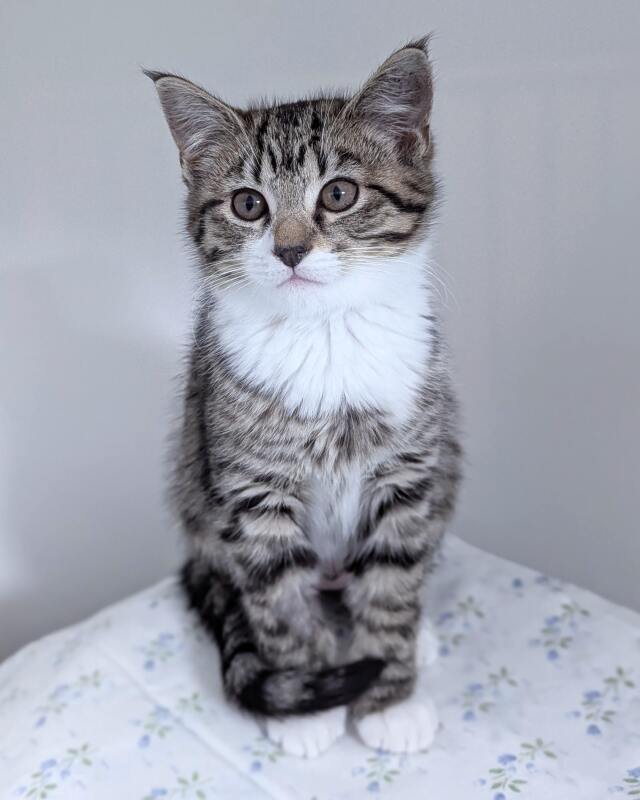 Hello there! My name is Cirilla, but you can call me Ciri. I am a 2-month-old female Domestic Short Hair kitten with a vibrant personality and a whole lot of love to give. I am a ball of energy, always ready to play and explore. I am not too picky about my playmates, I get along with almost everyone. I haven't been around kids yet, but I'm sure I can adjust and love them just as much as anyone else. As a young kitten, I am still learning about the world and I would love for you to be my guide. My high energy level means we will never have a dull moment together. I promise to fill your life with purrs, cuddles, and endless entertainment. Could you be my forever family? I can't wait to meet you!