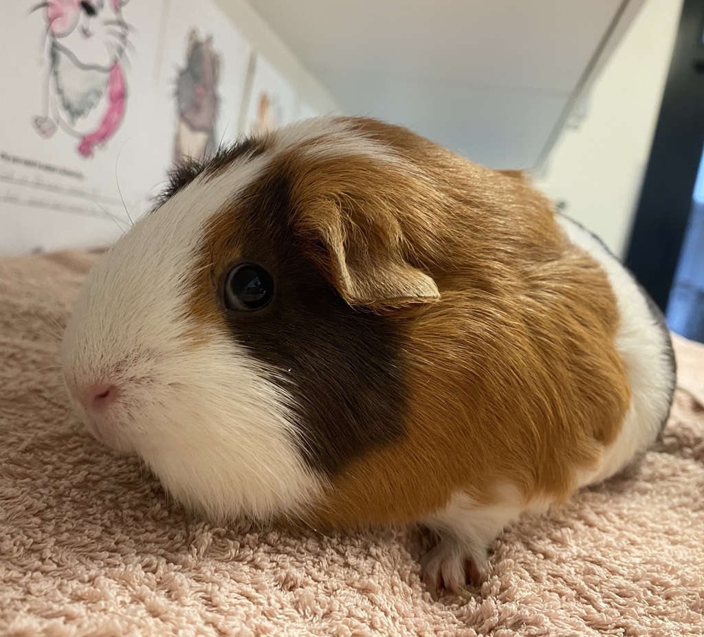 Sweet Potato is a sweet and curious little lady who loves to wheek excitedly when she hears the rustling of a veggie bag! She's gentle, sociable, and always up for a snuggle once she gets to know you. Bella enjoys lounging on soft fleece, munching on hay, and zooming around during her floor time adventures.