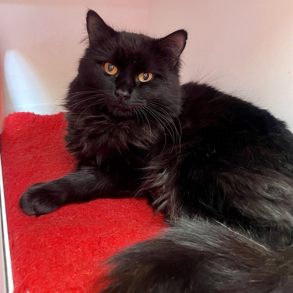 Meet Xavier, a stunning 9-year-old, long-haired gentleman with a mysterious charm. His sleek, black coat and wise eyes give him an air of quiet elegance. Xavier enjoys calm, cozy spaces and the occasional gentle stroke. He's independent but affectionate in his own time. Perfect for a peaceful home, he'll be your silent, watchful companion. Let Xavier bring a little magic into your life.