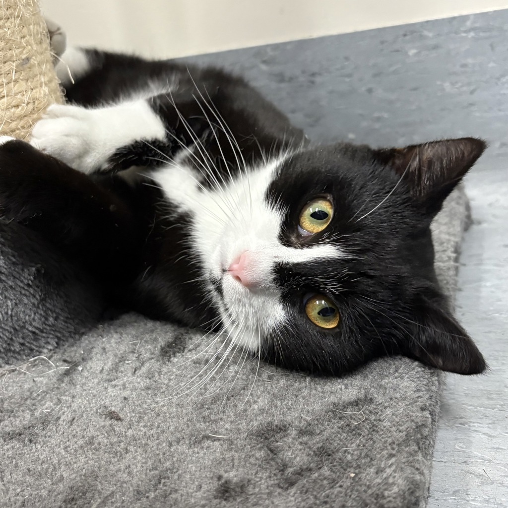 If you're looking for a fun-loving cat with a gentle soul and an adorable tuxedo coat, Augie's your guy. 🖤🤍