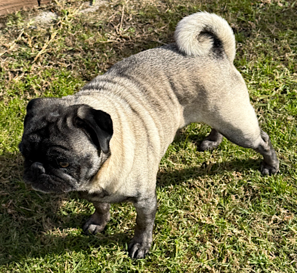 Poppet is a 5 year old, desexed, sable, female Pug. She is not as confident as Conrad and has never been without another dog or a human for company. She is also good with all other dogs and people and will follow Conrad with the bird chasing. They both love walks and are house-trained.