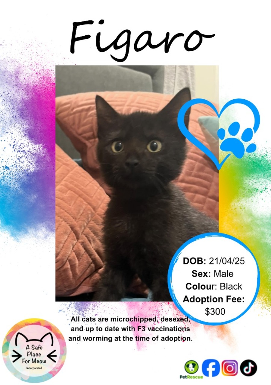 Figaro is more than just a bundle of energy; he's also a loving and affectionate companion who enjoys lounging around. His presence is calming and bright, and his playful nature is sure to bring out the smiles in anyone fortunate enough to join his new family.