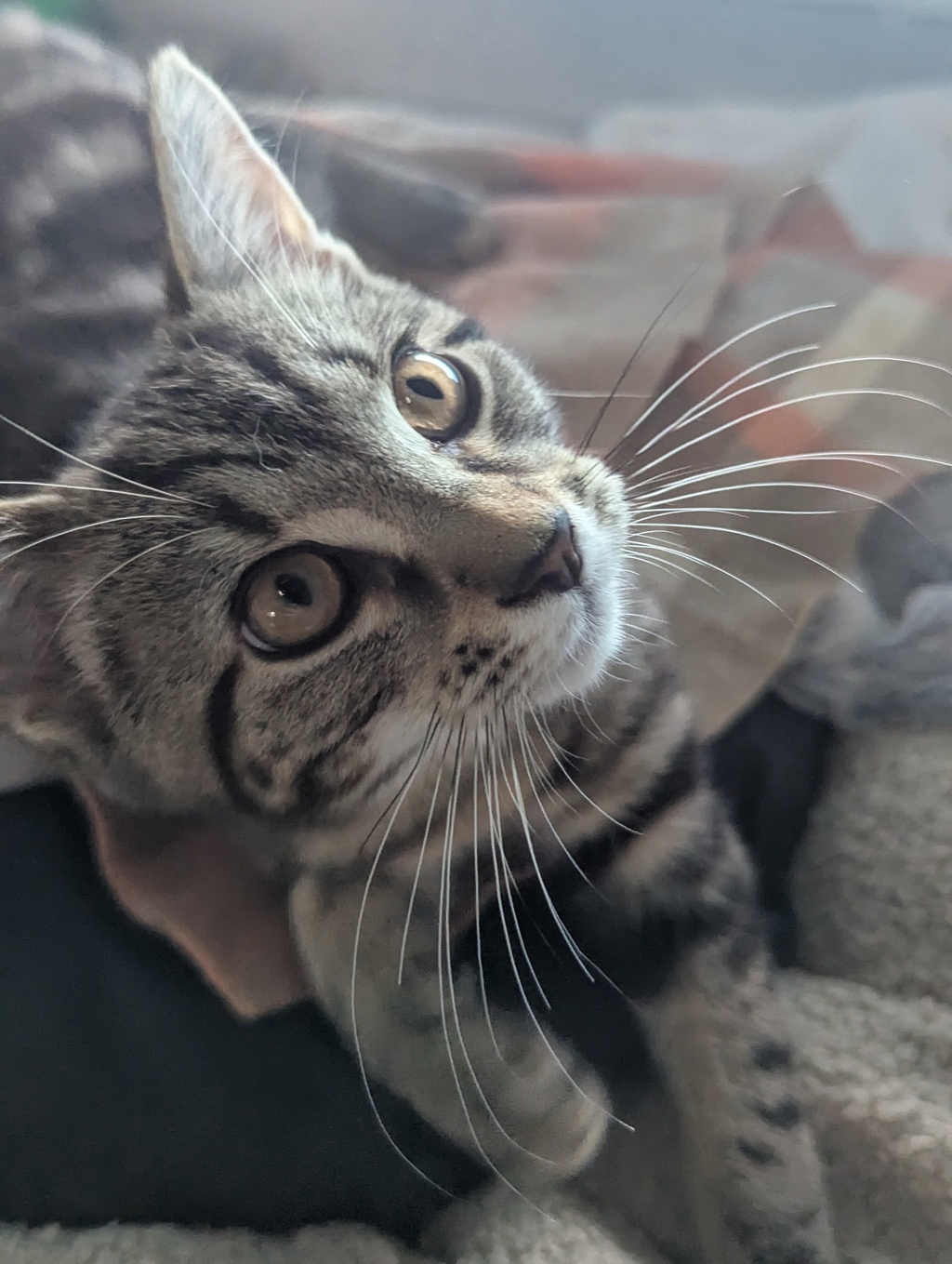 I'm still just a young boy, but everyone says I'm one of the sweetest little kittens around. I've got a calm and gentle soul, and I love a good cuddle. I'll happily curl up on your lap for a nap, purring away while you give me head scritches.