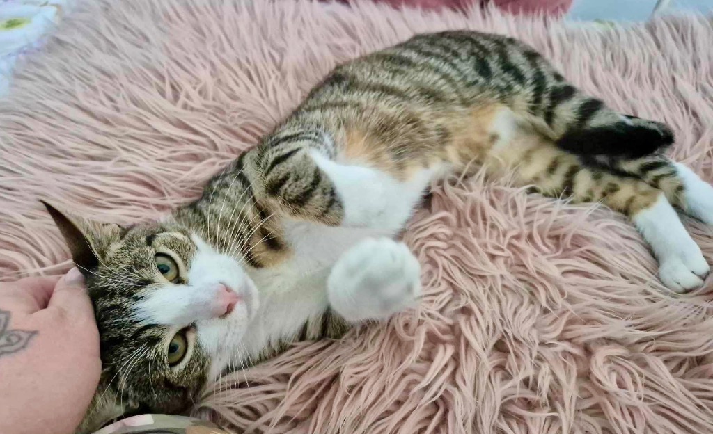 Zorg is a short-haired tabby boy with a striking white face and a somewhat comical, too-short-looking tail that only adds to his charm. He’s sleek, energetic, and absolutely bursting with personality. He adores attention and will happily spend his time snuggled next to you, playing with his toys, or trailing after you to see what you’re up to. He has a bright, friendly disposition and settles beautifully into household routines.