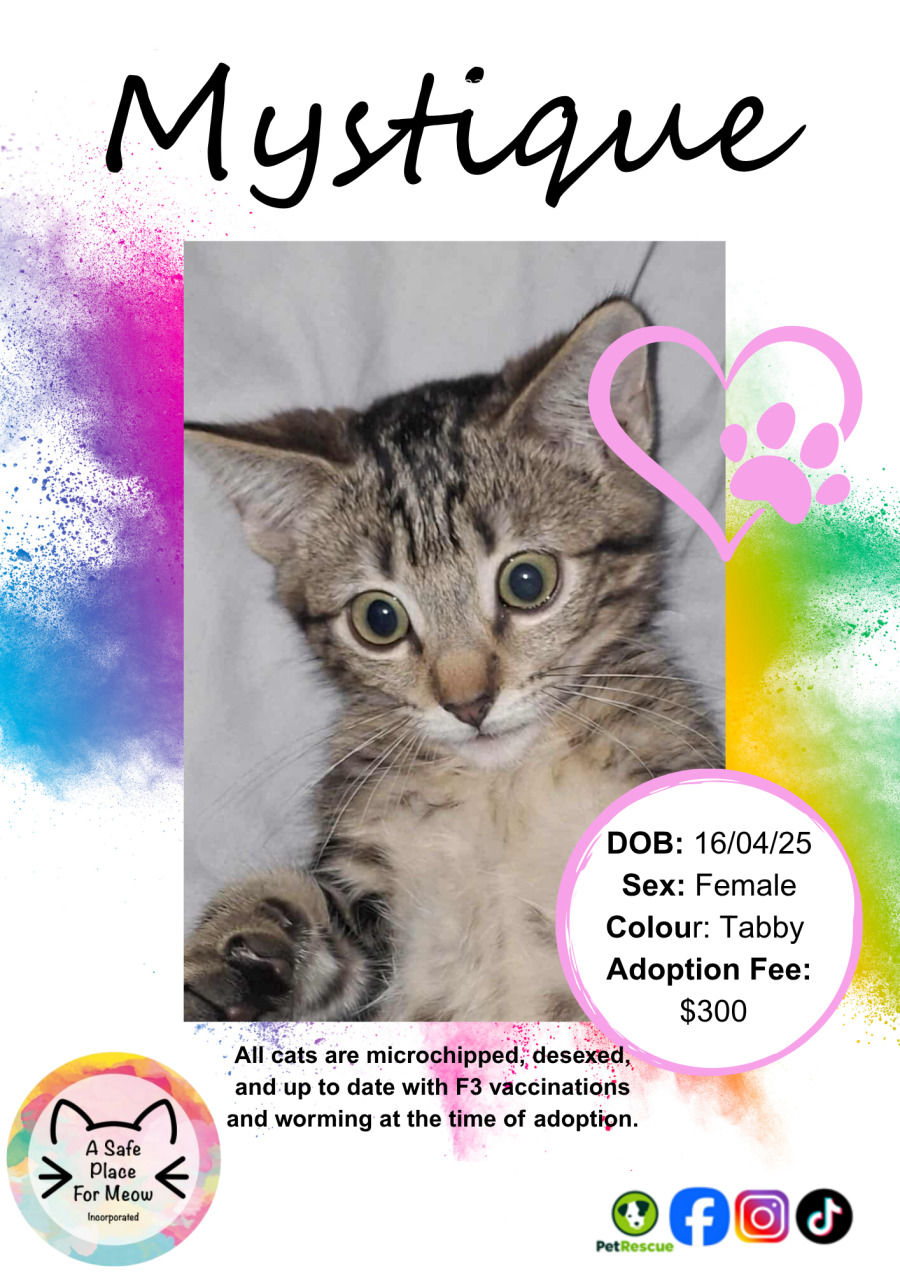 If you're searching for a cat who embodies pure love and companionship, Mystique is ready to make your home complete. With her by your side, you'll experience endless moments of joy and tranquility. Prepare to fall completely under her spell as she purrs her way into your heart.
