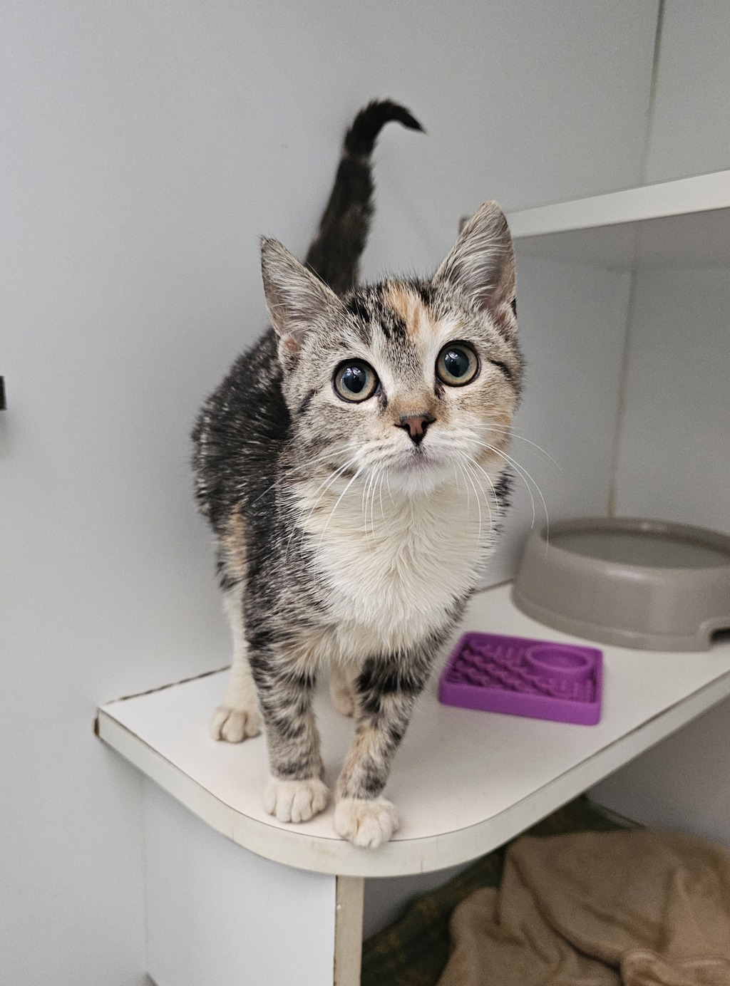 Hey there, I'm Panini. I'm a friendly and affectionate kitten who would suit most homes! My playful paws are always ready to pounce on anything that moves. I love playing with wand toys and mysterious shadows on the wall! When I'm finished playing, I love nothing more than finding a warm lap to curl up in.