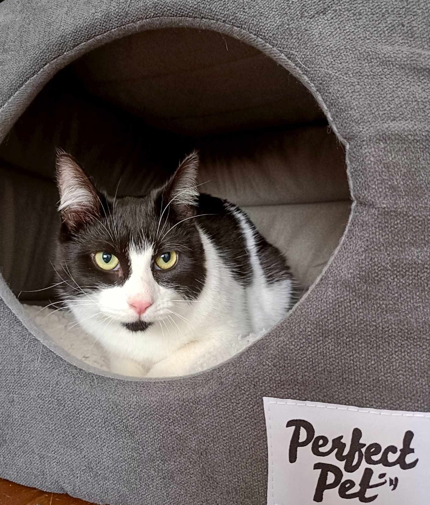 With his striking black-and-white "cap and saddle" markings and that dashing goatee (which gives him a permanently surprised expression), Sly Cooper is undeniably handsome. His sleek, soft coat and quiet demeanor hide a sweet, good-natured personality that emerges once he's comfortable. He's become quite the affectionate boy in his own way - showering his trusted humans with head-donks, happy dribbles when content, and enthusiastic biscuit-making sessions in bed. While initially shy, he's playful when relaxed and particularly enjoys his kibble tower and catnip toys.