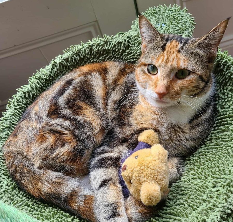 Patches is a very affectionate young cat who loves cuddling up to her foster carer! Give her a ball and she will be chasing it around like mad, play with a string and watch her leap!! She is very playful and loves attention. She can be quite chatty too! At night, she will snuggle up to her carer.
